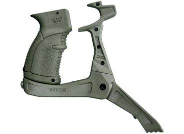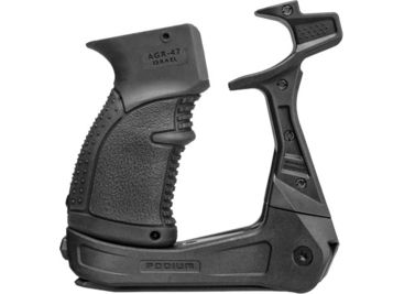 The AK-Podium implements a bi-pod support for the AK-47 platforms in a new and innovative way. The AK-Podium enables the operator to install a steady and durable bi-pod platform without adding front-end weight and saving valuable rail space. The AK-Podium is easily deployed with the main shooting hand, without having to alter the grip on the weapon, or lose sight of the target. US Patent No. 9,354,012. Compatibility: AK-47/ AKM standard models" Additional Features & Benefits: Compact and sleek design with no protruding parts Rapid deployment mechanism operates by the push of a button Provides steady and durable bipod platform Quick and easy installation, no Gunsmith required Made of light and durable high-end reinforced polymer composite Saves valuable rail space for additional mounting options Includes the AGR-47 pistol grip.![]()
