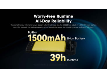 The EDC23 can be conventionally charged through its built-in USB-C port. Once fully charged, the EDC23 can achieve a maximum runtime of 39 hours on its lowest mode and can be fully charged in just 1.5 hours.