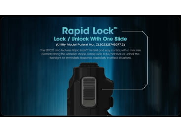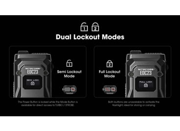 Designed for versatility, it provides five brightness levels and a Strobe mode. If the light turns off, the EDC23 features memorization and will return to the previously used mode. Its digital OLED screen displays the brightness level, remaining battery power, and more. For quick access, half-press and hold the mode button for Turbo, or fully press and hold it for Strobe. This makes EDC23 an excellent tactical flashlight as well. To prevent overheating, the EDC23 automatically reduces brightness if accidentally activated in High mode. This feature activates only when the light is turned on unintentionally and deactivates during regular use. Additionally, the EDC23 features an easy-to-use sliding lock switch to prevent accidental activation. It comes with two lockout modes: Semi and Full. In Semi Lockout, you can Turbo and Strobe, while Full Lockout will disable all functions.