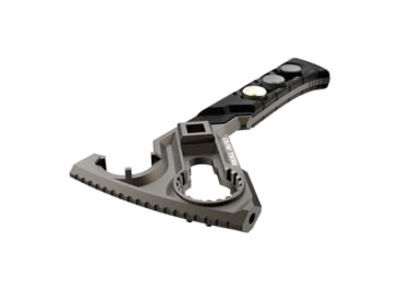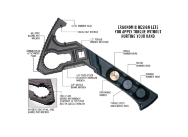 When it comes to using the Armorers Master Wrench, think precision. The ergonomic handle gives you the ability to apply serious torque needed to remove stubborn, crusted-on barrel or castle nuts without marring your firearm or stripping the nuts. The tool holds shape under pressure and has deep set sockets to grip your nuts and keep them gripped. The torque wrench attachment point allows you to apply accurate and critical torque adjustments to the barrel nuts, castle nuts, muzzle brakes, flash suppressors, and fixed stock receiver extensions. Plus, this is the only tool in the category to include a fully-functional, customizable armorers hammer in the same tool. Features/Specifications: Features: Barrel nut wrench precisely fits free-float style barrel nuts Castle nut wrench specifically designed to work around mil-spec and aftermarket end plates 3/4 wrench fits most muzzle brakes Three interchangeable hammer heads (nylon, rubber, brass) Hardened stainless steel for maximum strength and durability Ergonomic design lets you torque all day Specs: Castle nut wrench torque receiver Fixed Steel Hammer Head Brass hammer head Nylon hammer head Rubber hammer head Torque specs laser etched behind hammer heads 5/8 wrench for fixed stock receiver extensions muzzle brake wrench free-float barrel nut wrench Mil spec barrel nut wrench Interchangeable hammer head receiver.![]()
